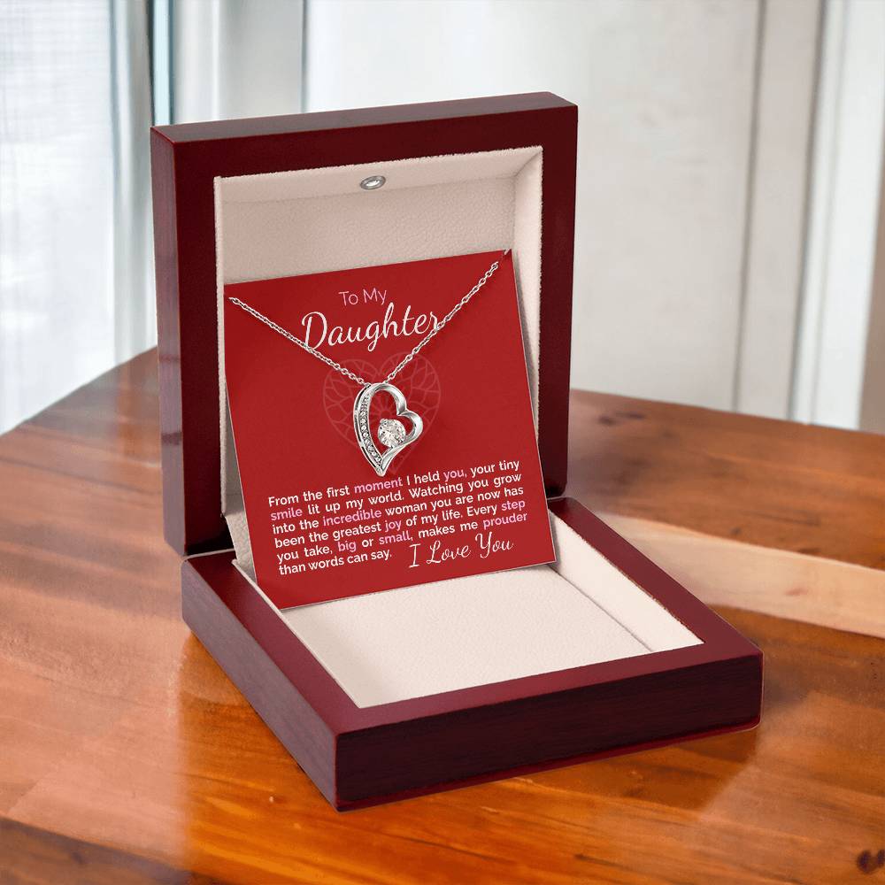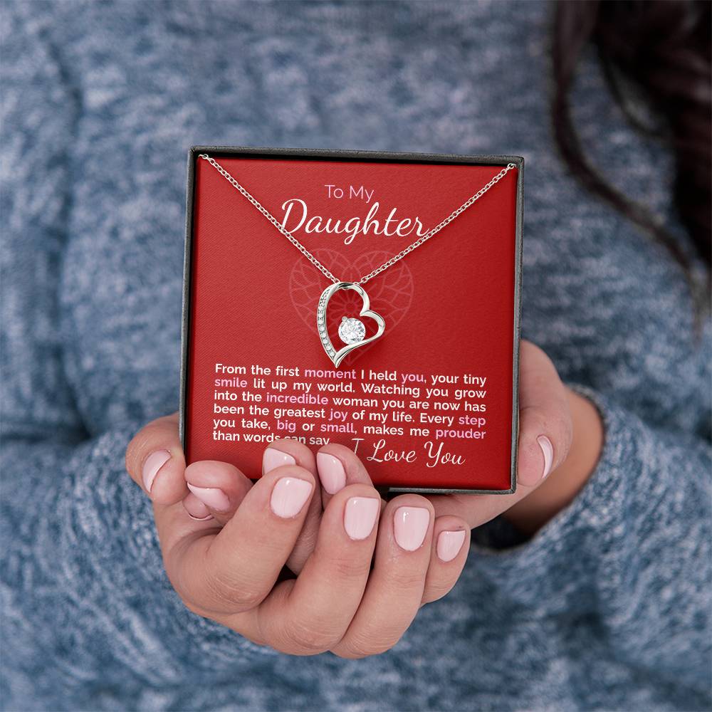 Celebrate the unbreakable bond between you and your daughter with this elegant jewelry gift. Engraved on the pendant is an expression of love and pride, perfect for any special occasion. The necklace comes with a heartfelt message card, making it a meaningful and memorable gift.