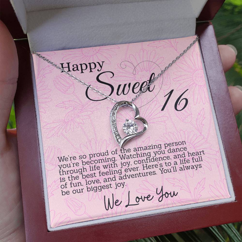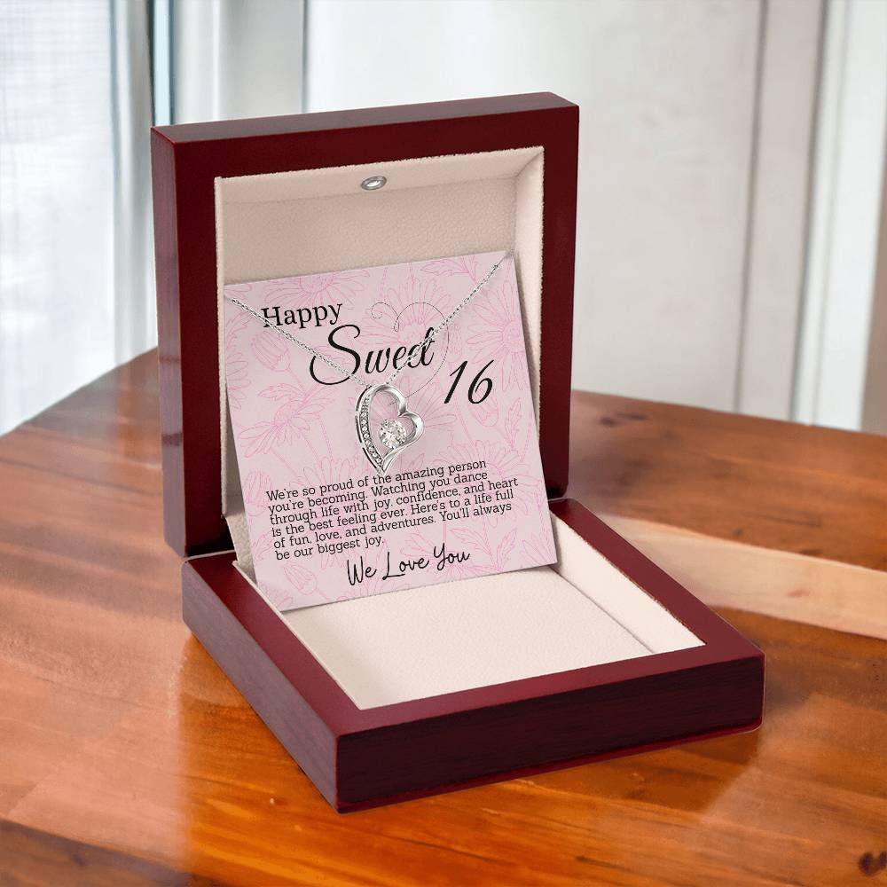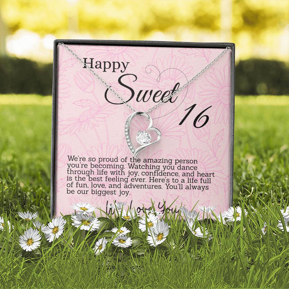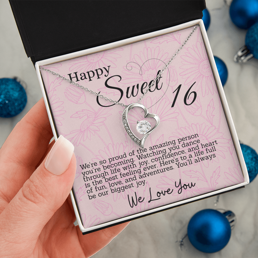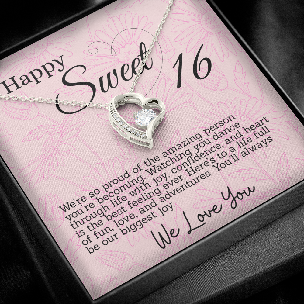This thoughtful gift for your Sweet Sixteen daughter features a sparkling heart pendant necklace and a special message card in a box. Each is inscribed with meaningful words to celebrate her big day. The beautiful necklace and touching words will make for an unforgettable Sweet 16th Birthday.