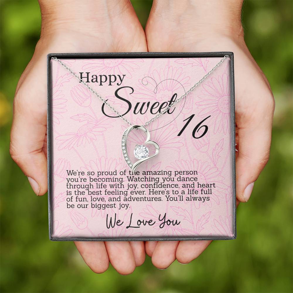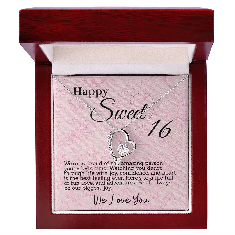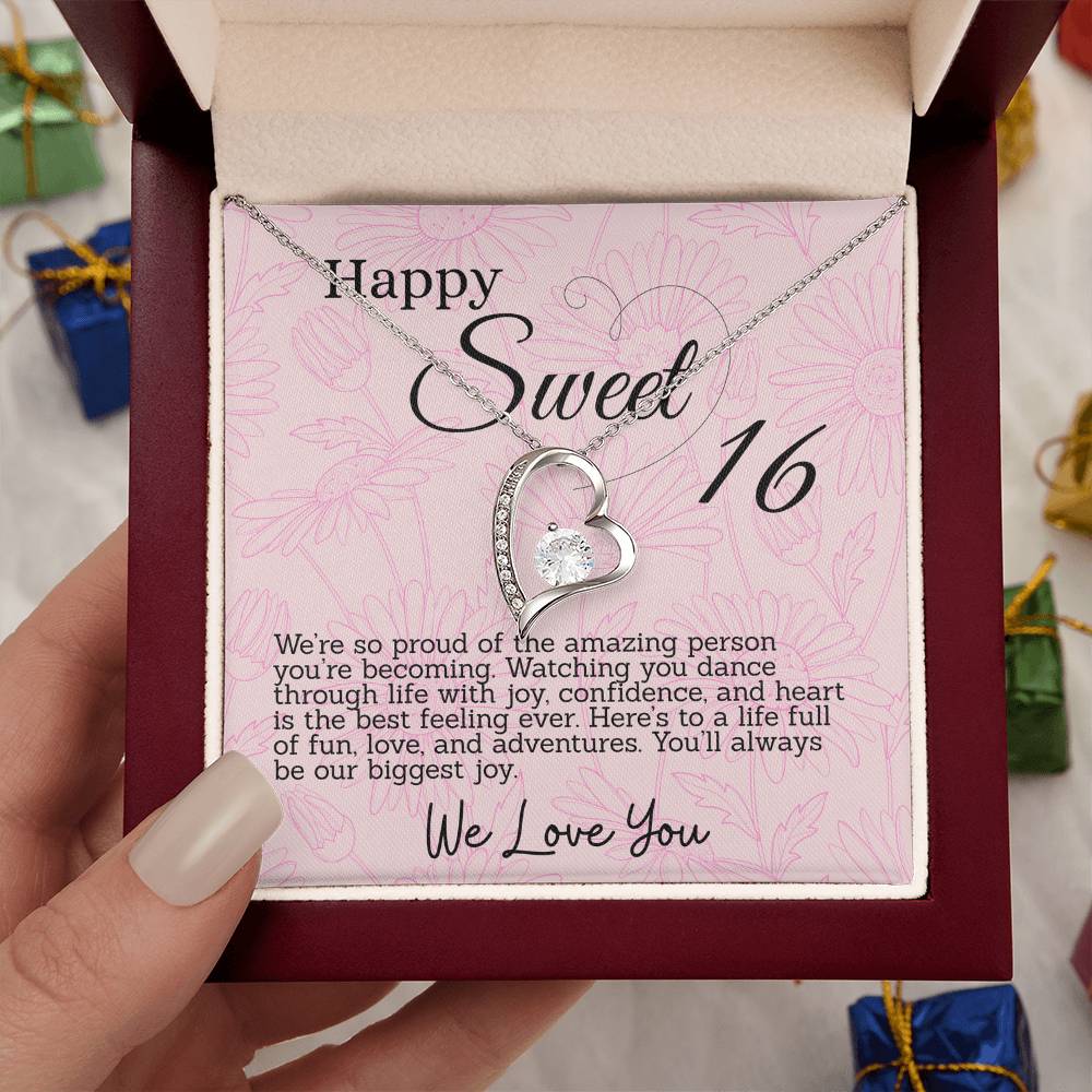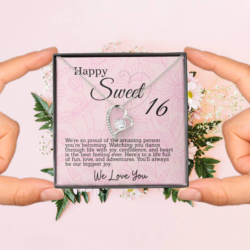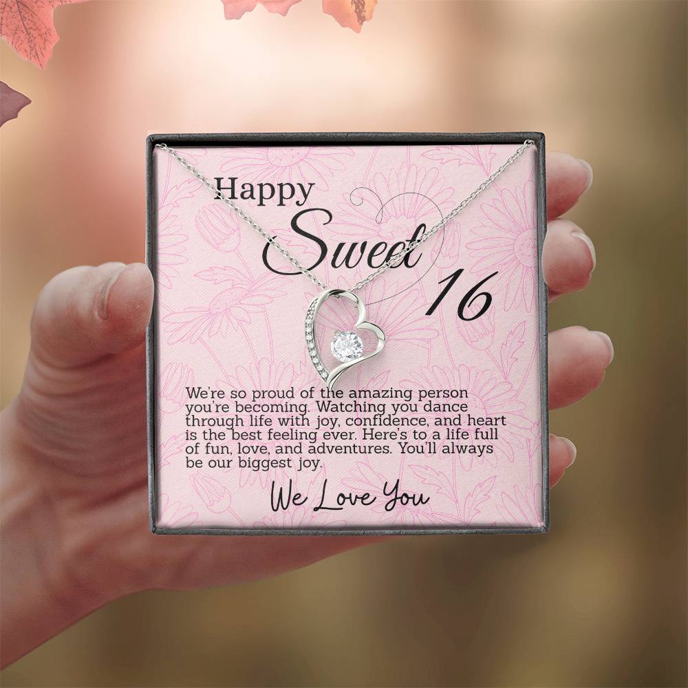 This thoughtful gift for your Sweet Sixteen daughter features a sparkling heart pendant necklace and a special message card in a box. Each is inscribed with meaningful words to celebrate her big day. The beautiful necklace and touching words will make for an unforgettable Sweet 16th Birthday.