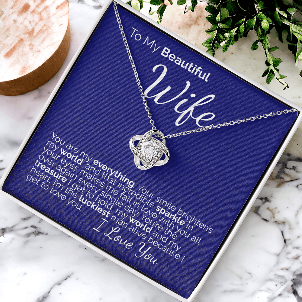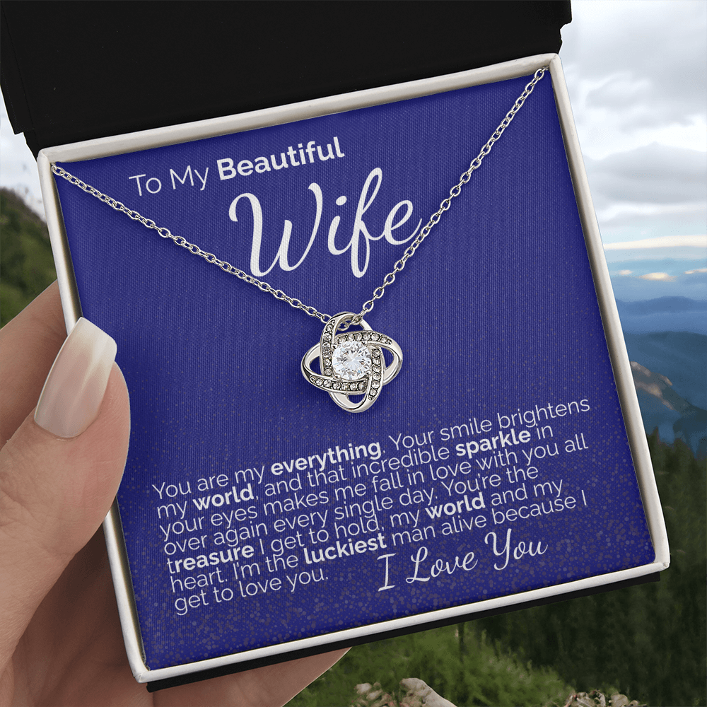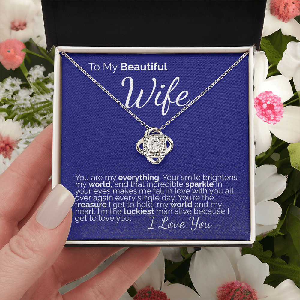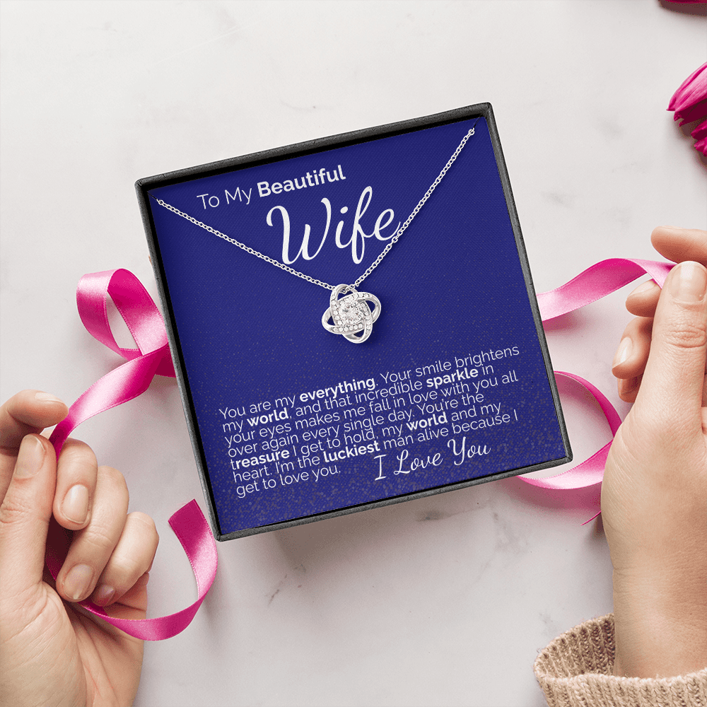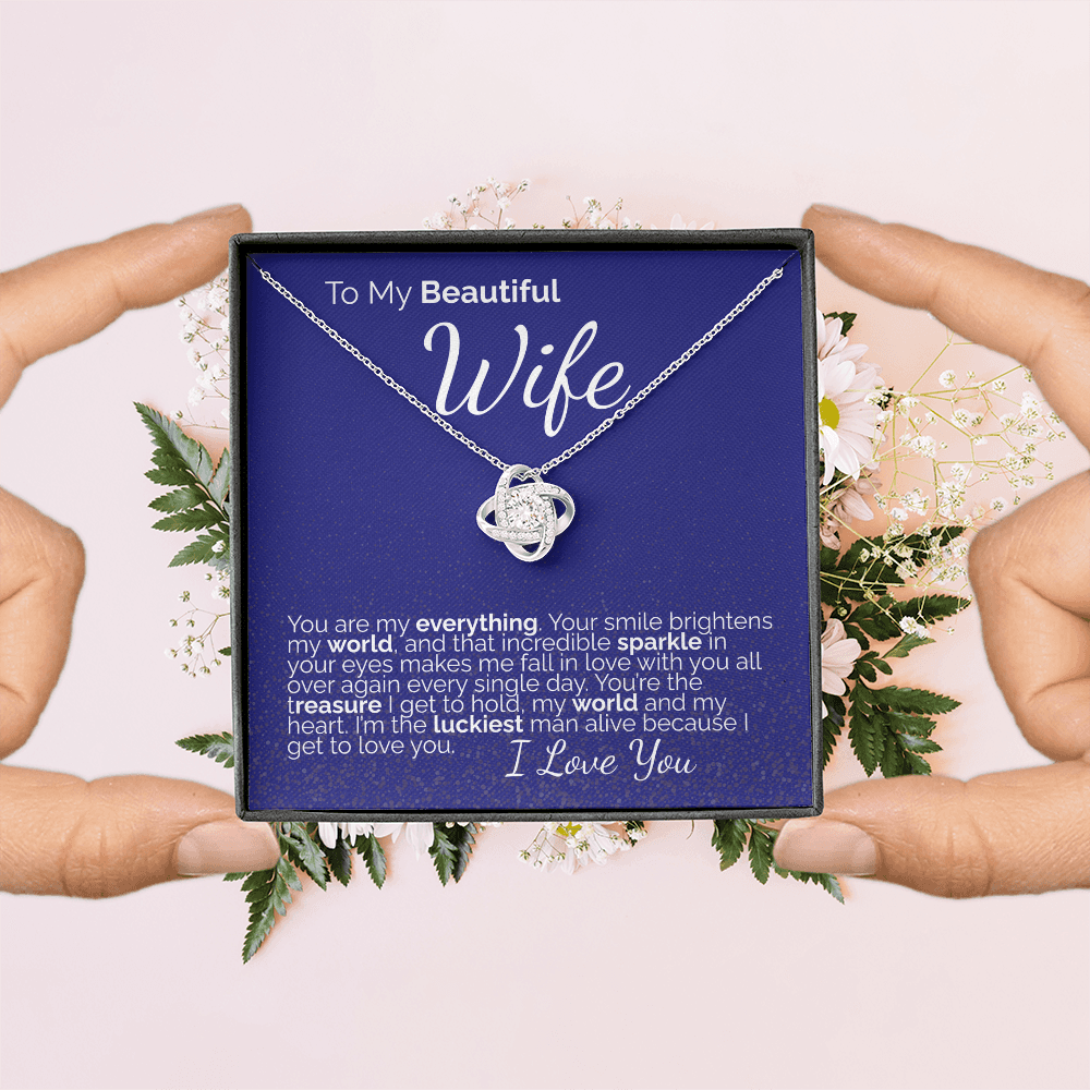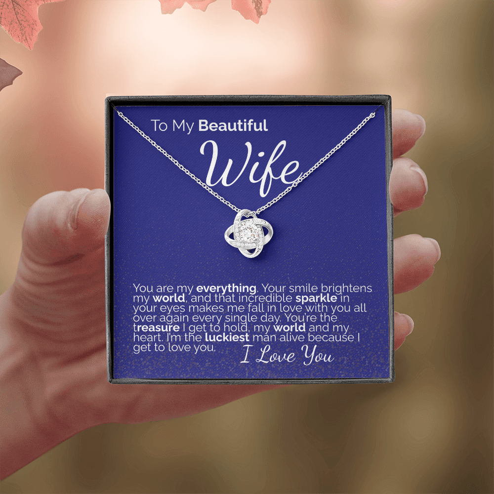 Surprise your special someone with this heartfelt gift box. The personal message card features beautiful and meaningful words, perfect for expressing your love for your wife on any special occasion. The unique jewelry piece also serves as a meaningful gesture, showing your appreciation for your partner's unwavering love and care. An elegant and thoughtful present that is sure to be cherished.