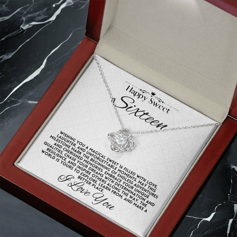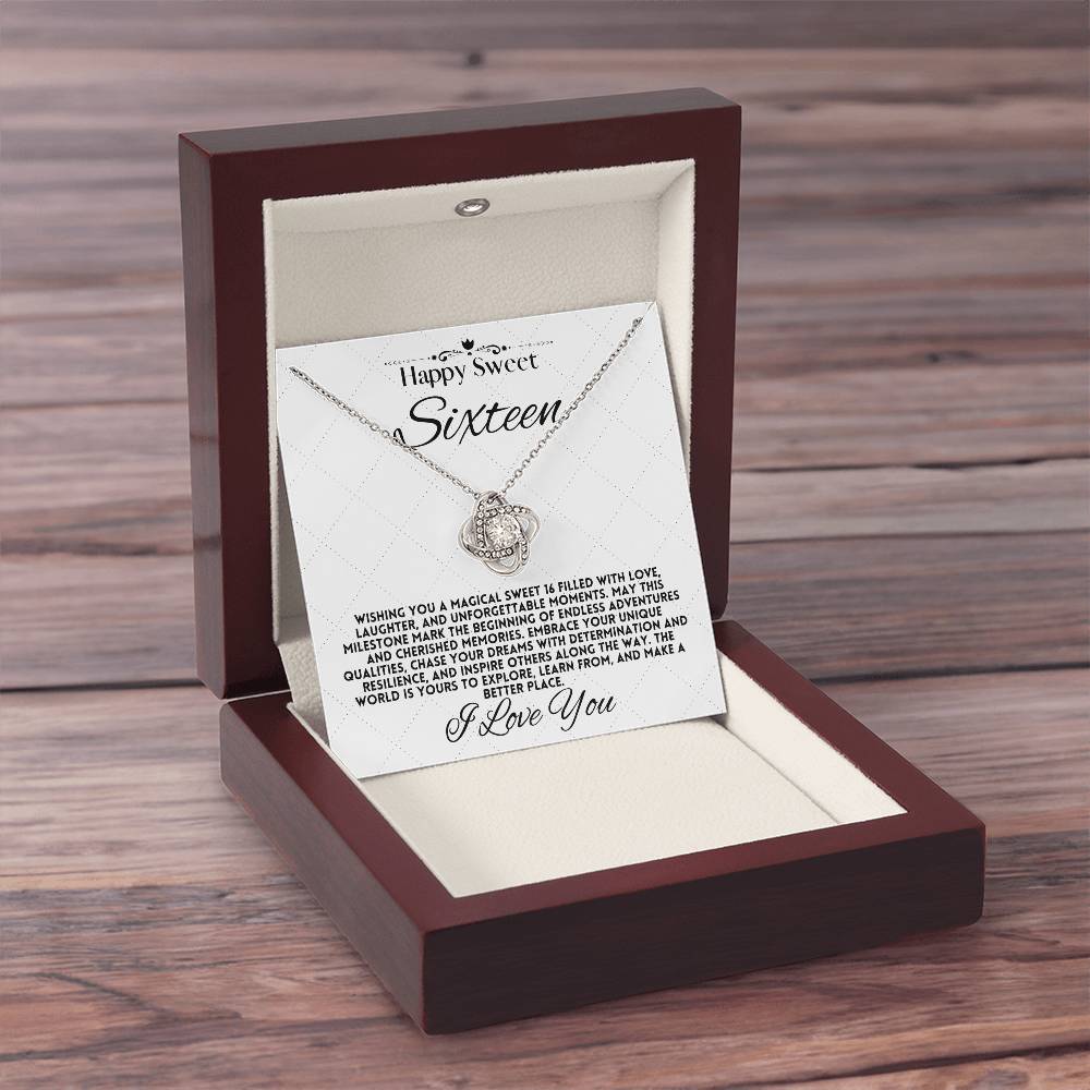 This Happy Sweet Sixteen Years Birthday Jewelry Necklace Gift is the perfect way to show your daughter that you recognize her journey into adulthood. Comprising of a unique design featuring the words 'Happy Sweet Sixteen', this gift will make her 16th birthday a memory to be treasured for many years to come. Show your daughter how special she is with this unique gift, and the words of love that come with it.